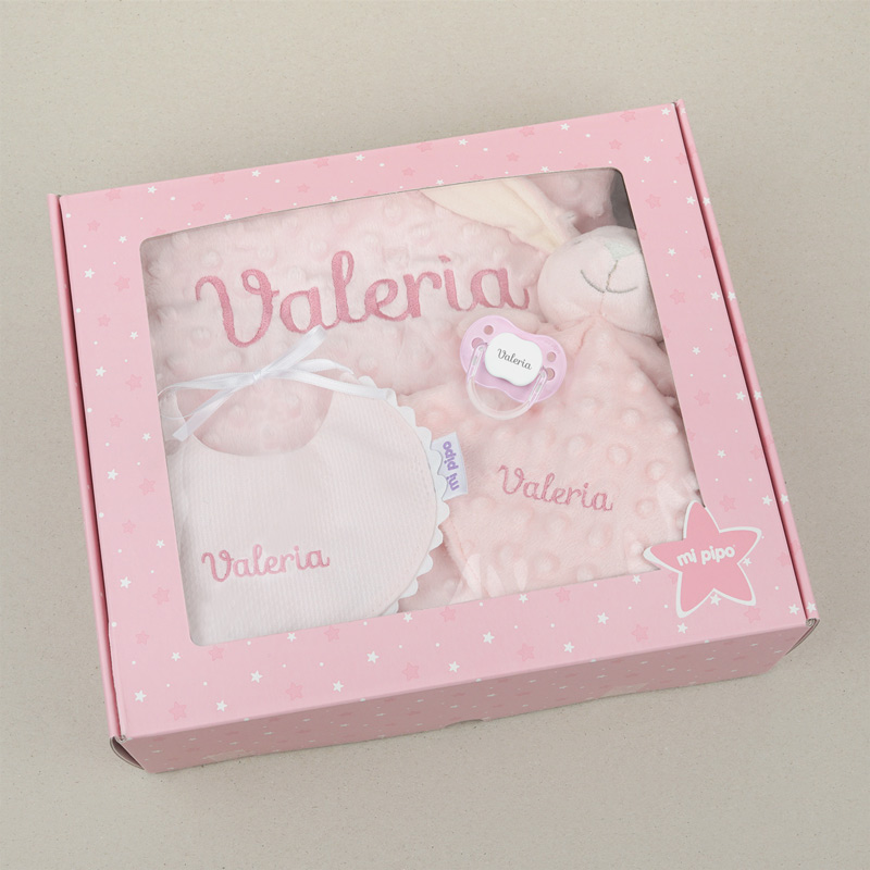Nuestra cajita Premium es top ventas porque es un regalo ideal para el recién nacido. Lleva 4 artículos esenciales personalizados y como se presenta en una bonita cajita de cartón de regalo es un acierto seguro.