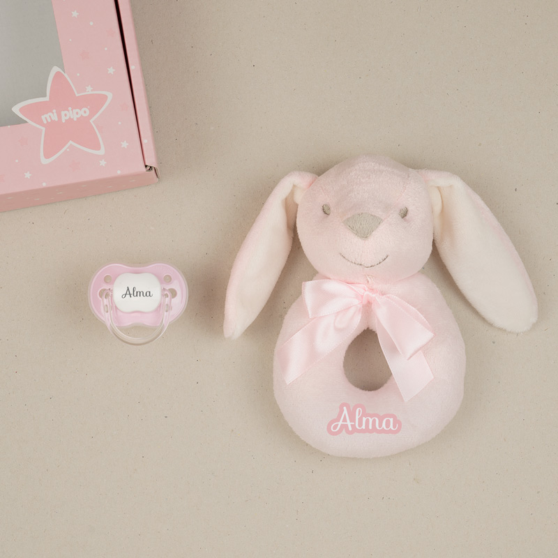 Cajita super regalable con sonajero y chupete personalizados. Se entrega en una bonita cajita de cartón para regalo.