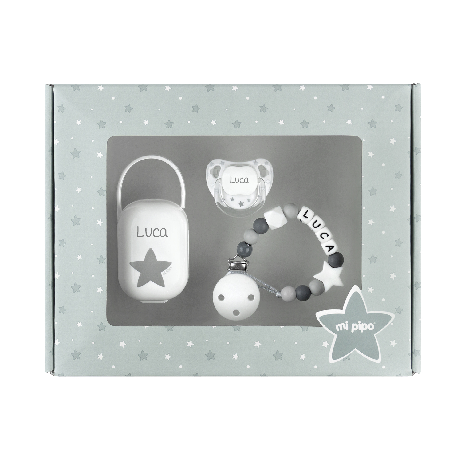 Esta cajita es un regalo imprescindible para el bebé porque lleva 3 de nuestros artículos más vendidos, todo personalizado con el nombre del peque. Y como se presenta en una bonita cajita de cartón de regalo es un acierto seguro.