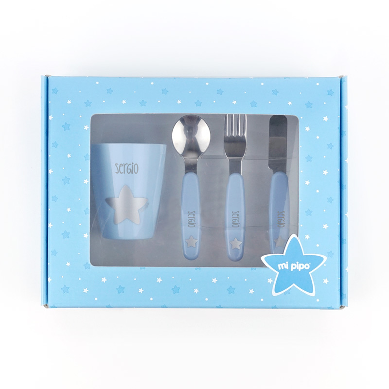 Cajita Vasito + Cubiertos Personalizada Azul